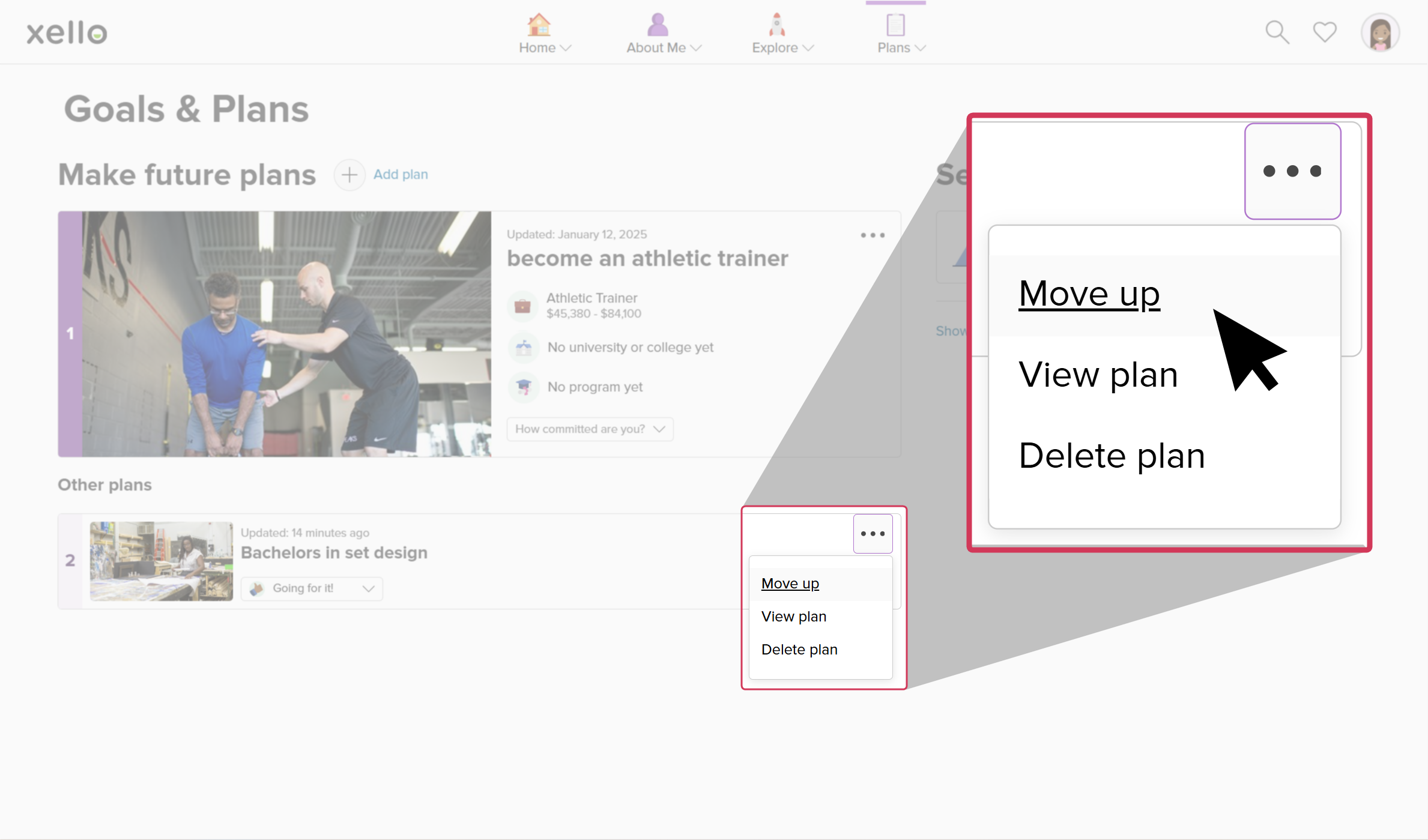 Student account in Xello on the Goals & Plans page. There are two plans. The cursor has clicked the three-dot menu on one and is selecting Move up.