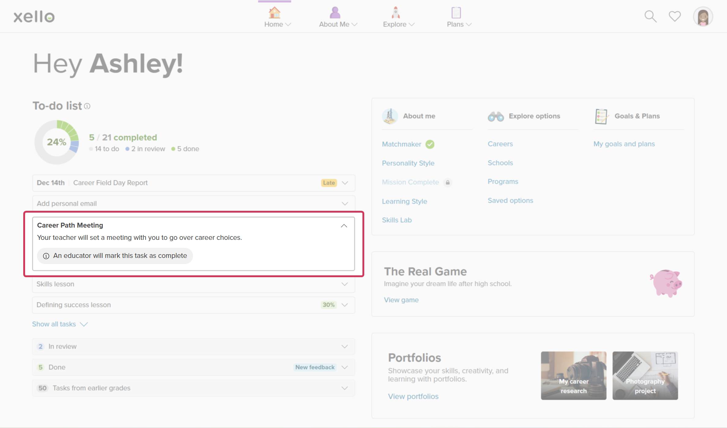 Use Custom tasks to build upon existing Xello activities or create entirely new activities that go beyond Xello's built-in curriculum. For example, create a custom lesson for students to update their resume with new experiences. Or assign a custom activity to track actions completed outside of Xello, such as creating a cover letter. Creating a portfolio project will help students organize and submit digital collections of their work.