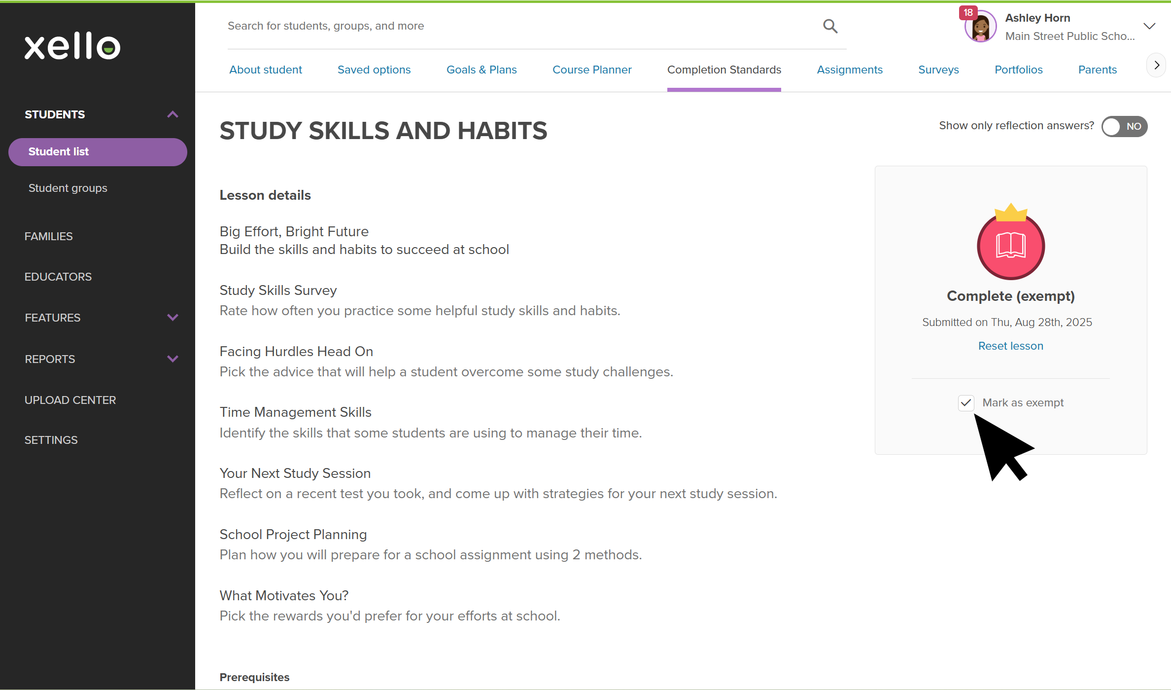 A student's profile in Xello on the Completion Standards tab. The Study skills and habits lesson is open. The cursor is highlighting the Mark as exempt box.