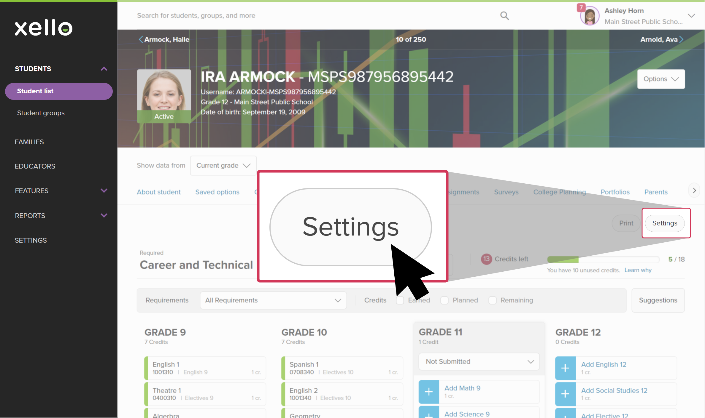 Student profile open to the Course Planner tab. The cursor is clicking on Settings.