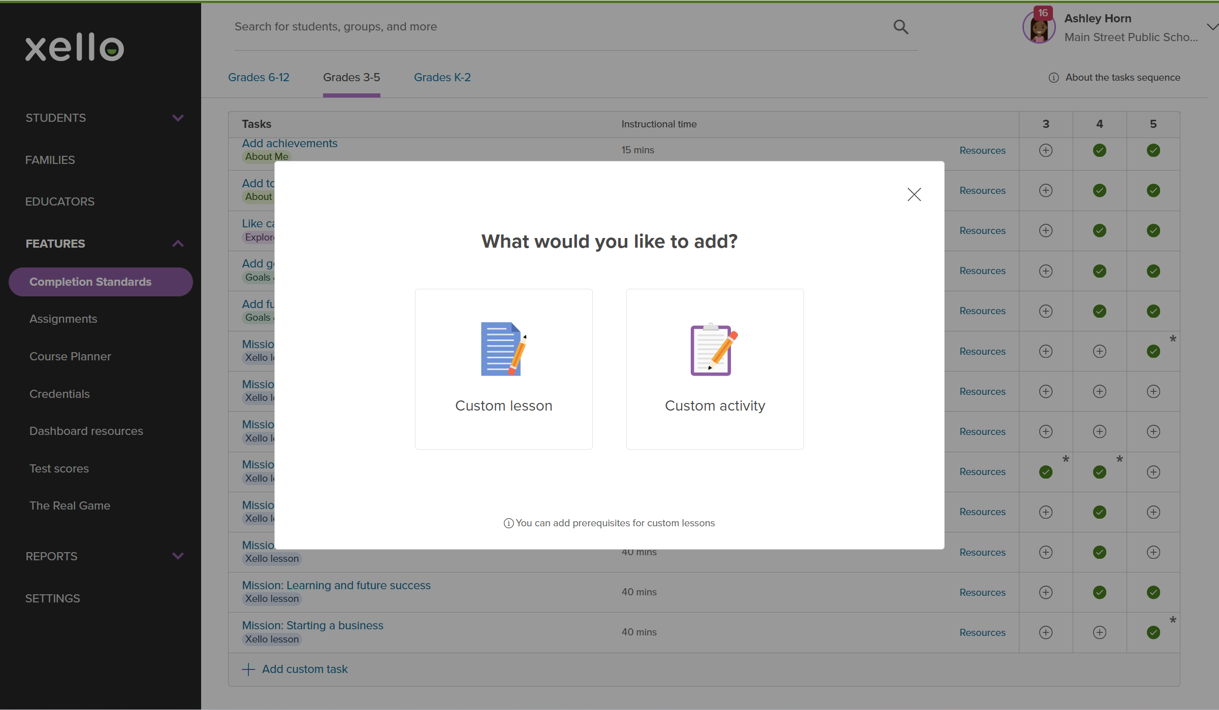 Educator account in Xello. The modal to add custom tasks is open. There is an option to choose between Custom lesson and Custom activity