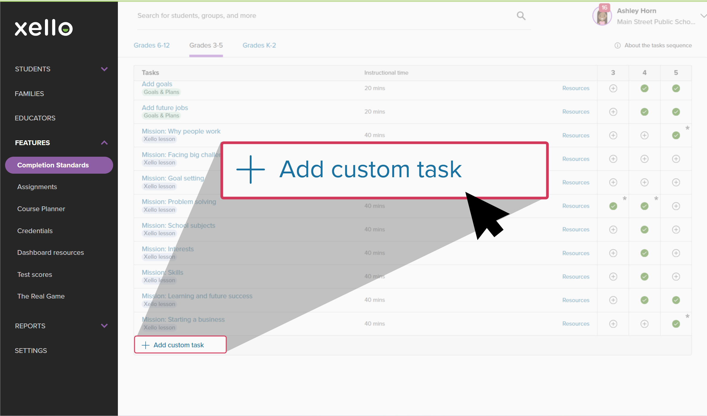 Educator account in Xello on the Completion Standards configuration page. At the bottom of the tasks list, the cursor is selecting Add custom task