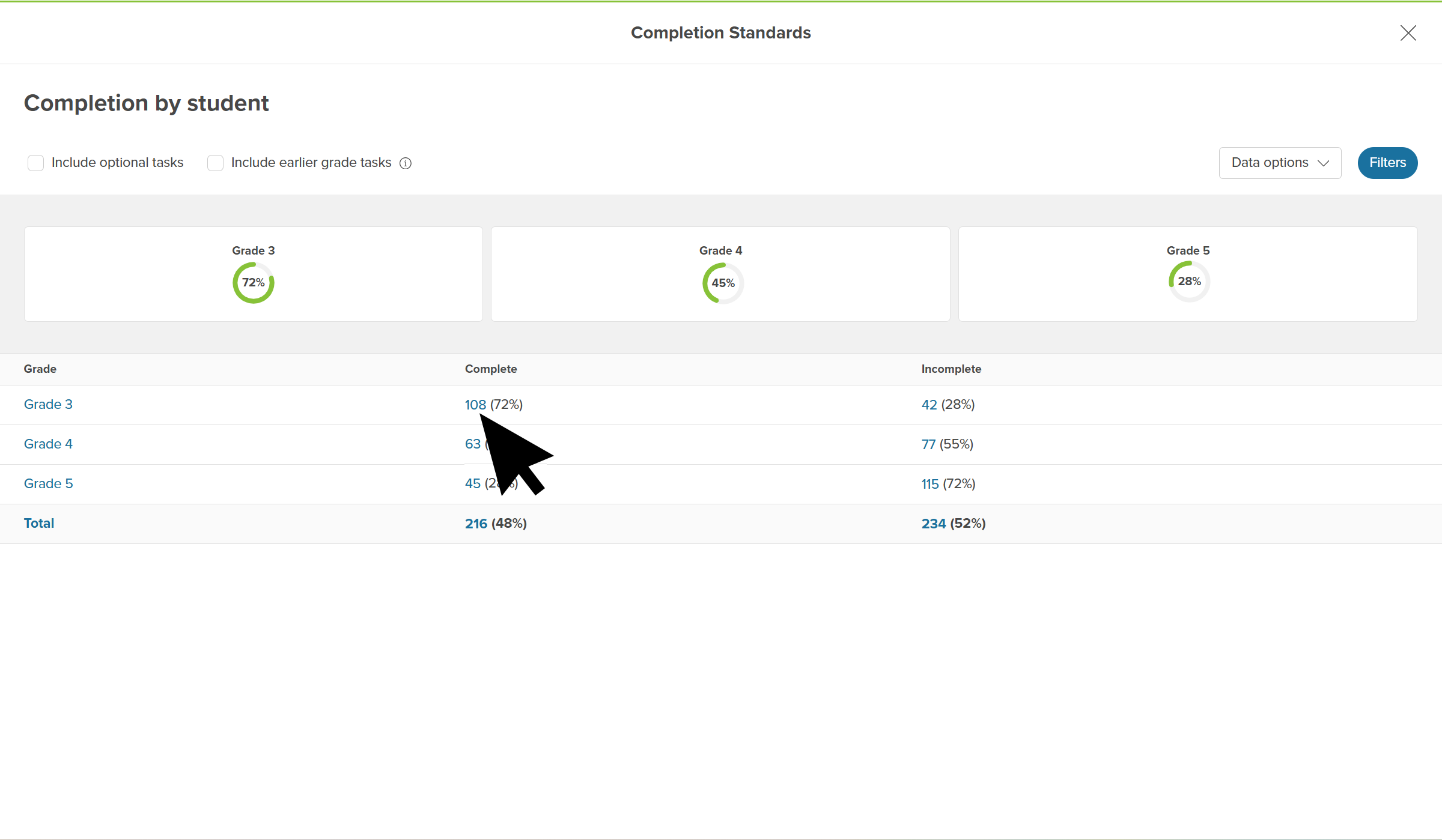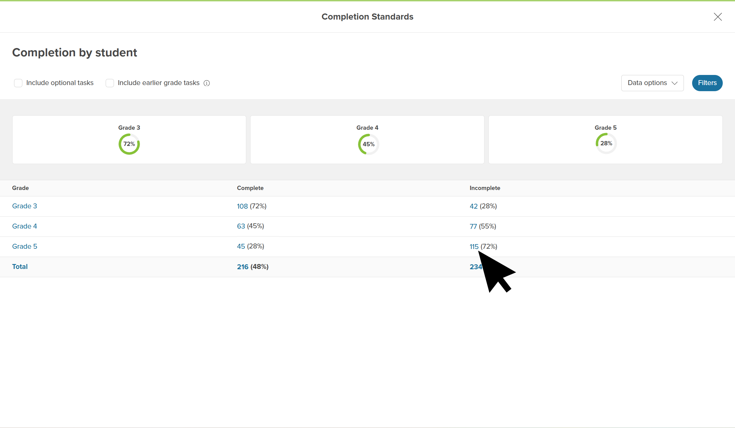 • In the Incomplete column, click the number next to the percentage to open the list of students in that grade and the tasks they have not completed.