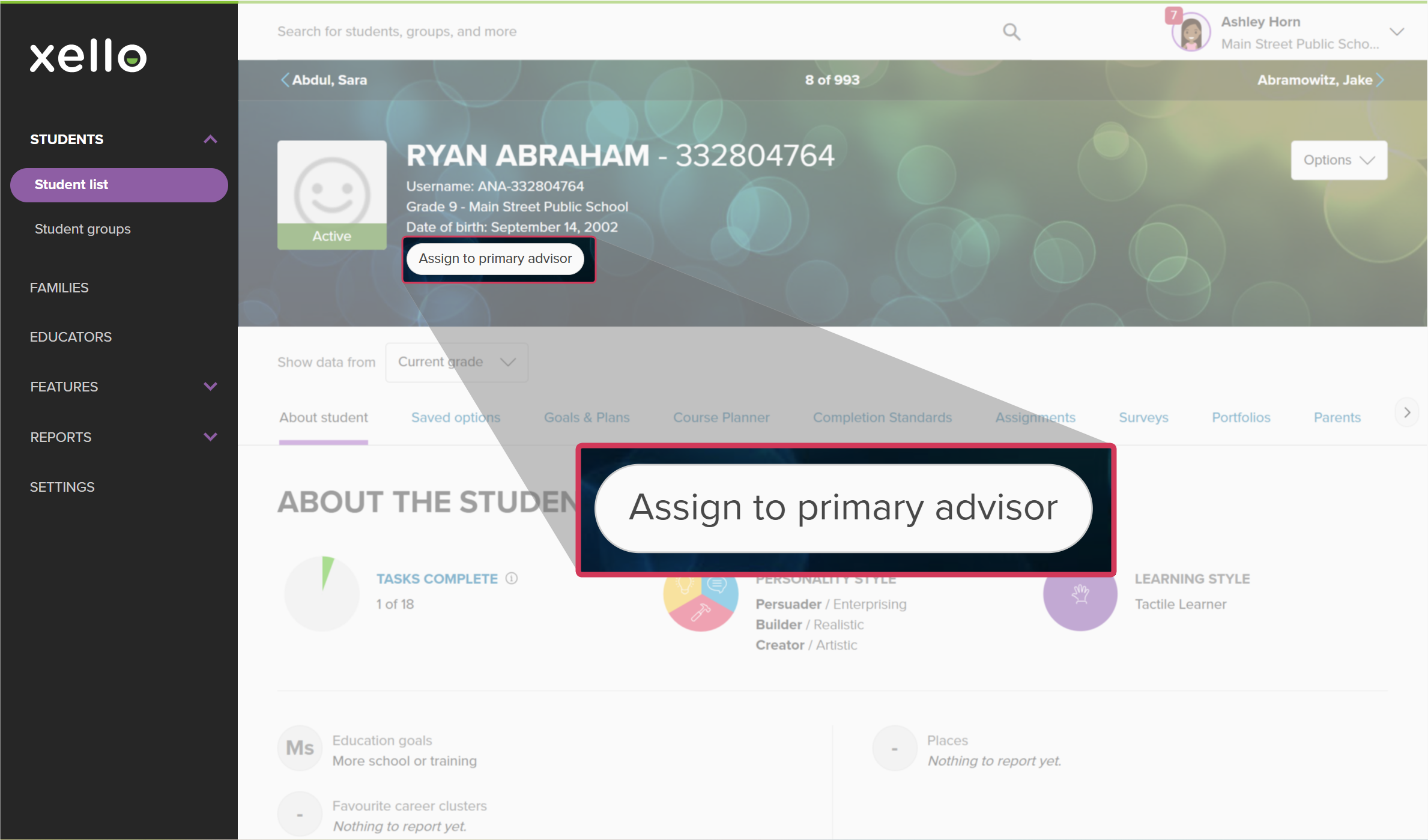 You can assign a primary advisor directly from a student’s profile. This in-context option makes it easy to assign while you’re in there reviewing their work in Xello.