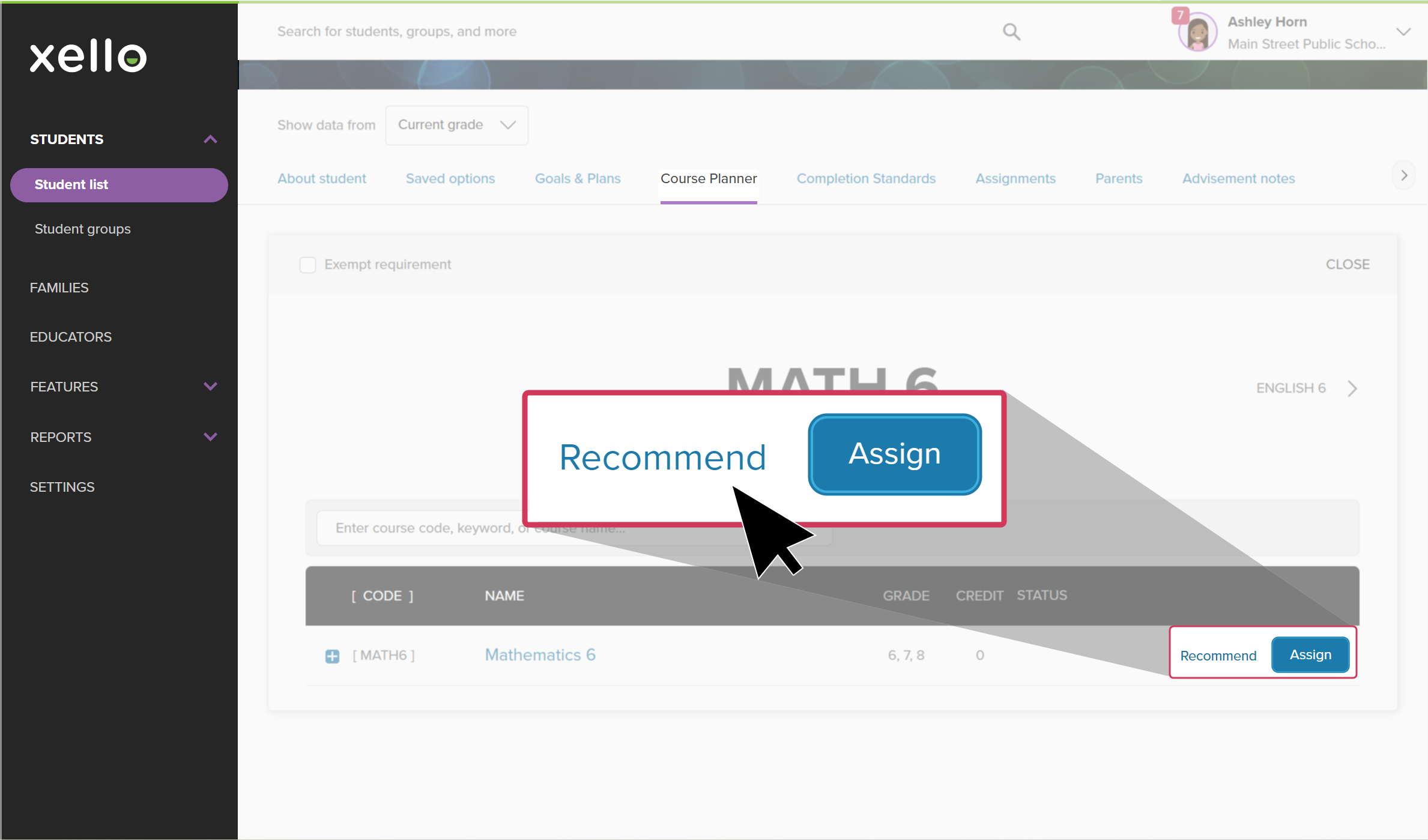 As an educator, you have the ability to view your student’s course plans and assign a course or override one of their course choices, if necessary. You can also recommend a course for them to review.