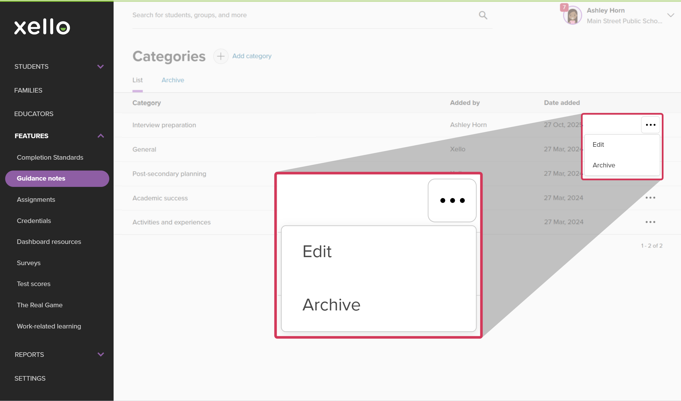 - Next to the custom category you want to archive, click the three-dot menu and select Archive.