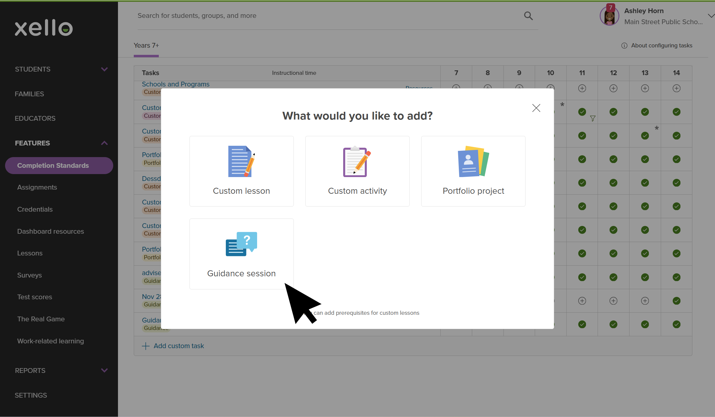 Educator account in Xello. The modal to add custom tasks is open and the cursor is selecting Custom activity