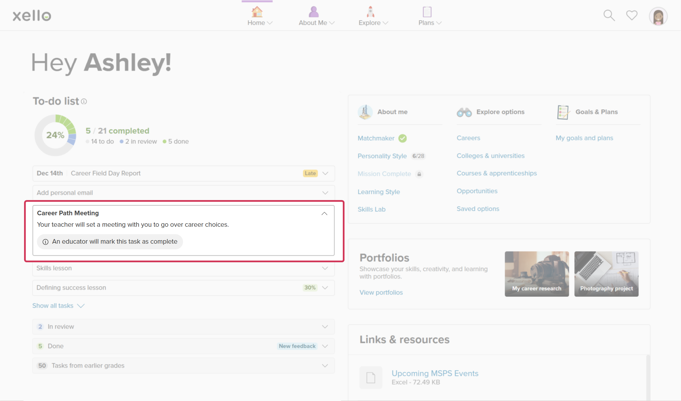 Use Custom tasks to build upon existing Xello activities or create entirely new activities that go beyond Xello's built-in curriculum. For example, create a custom lesson for students to update their CV with new experiences. Or assign a custom activity to track actions completed outside of Xello, such as creating a cover letter. Creating a portfolio project will help students organise and submit digital collections of their work.