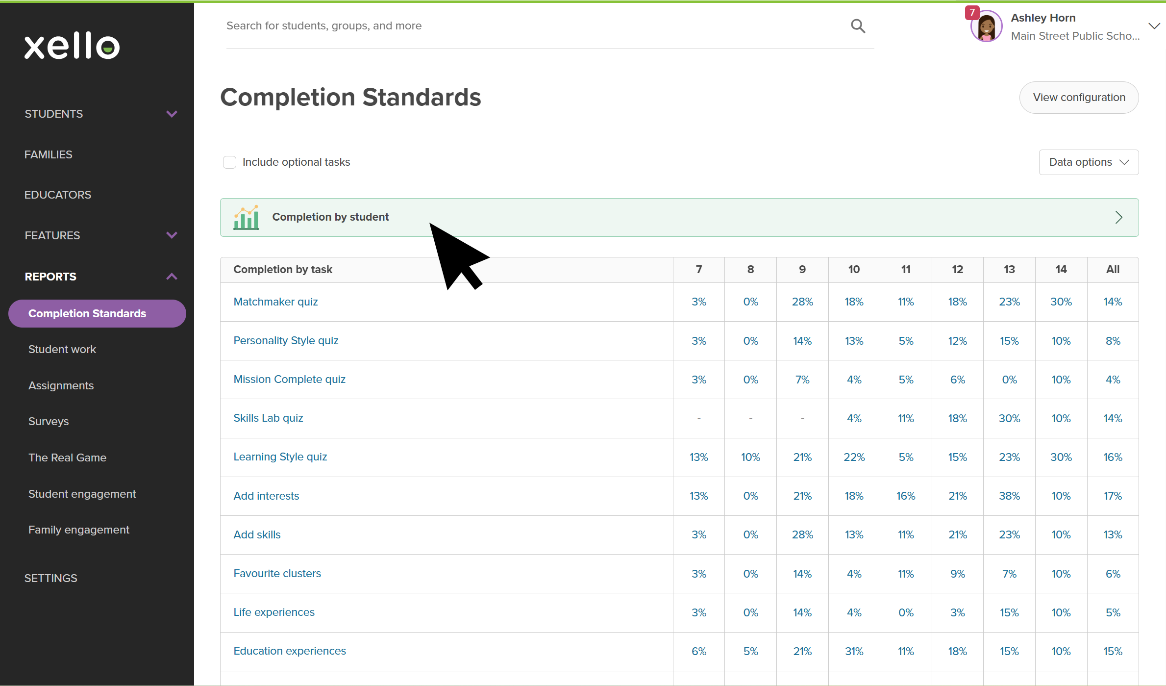 Educator account in Xello. The Completion by student report page is open. The cursor is clicking a grade to view the completion status of all students in that grade.