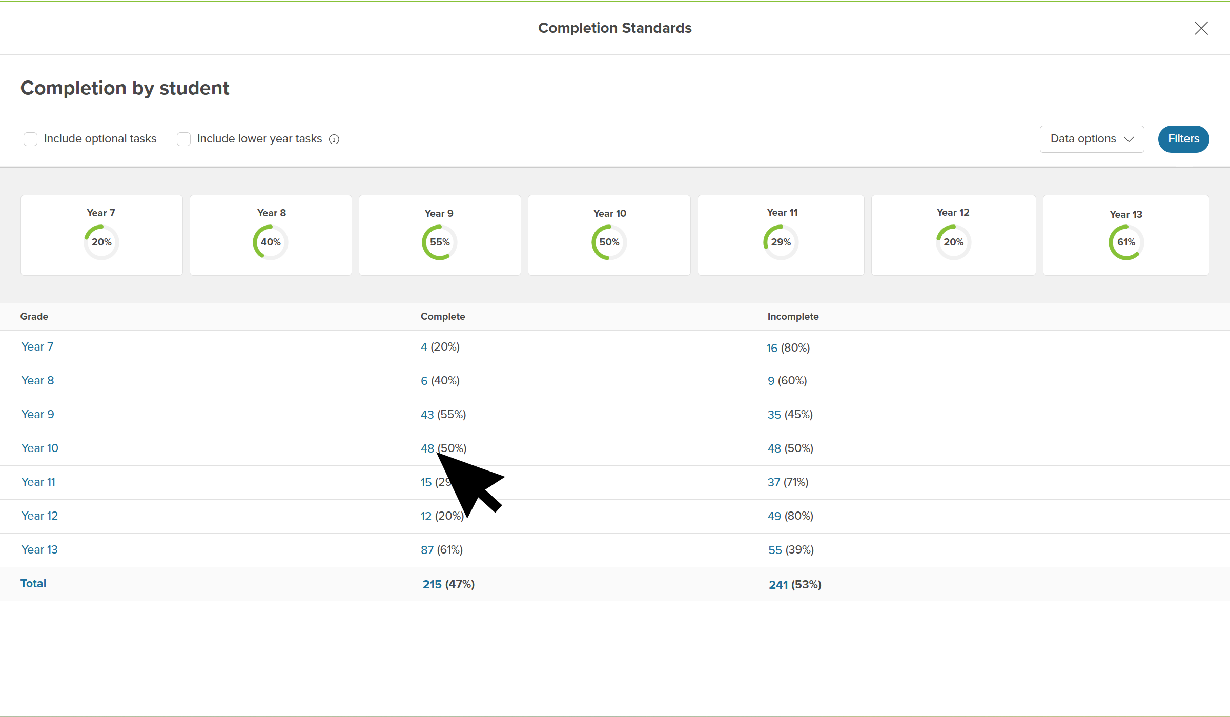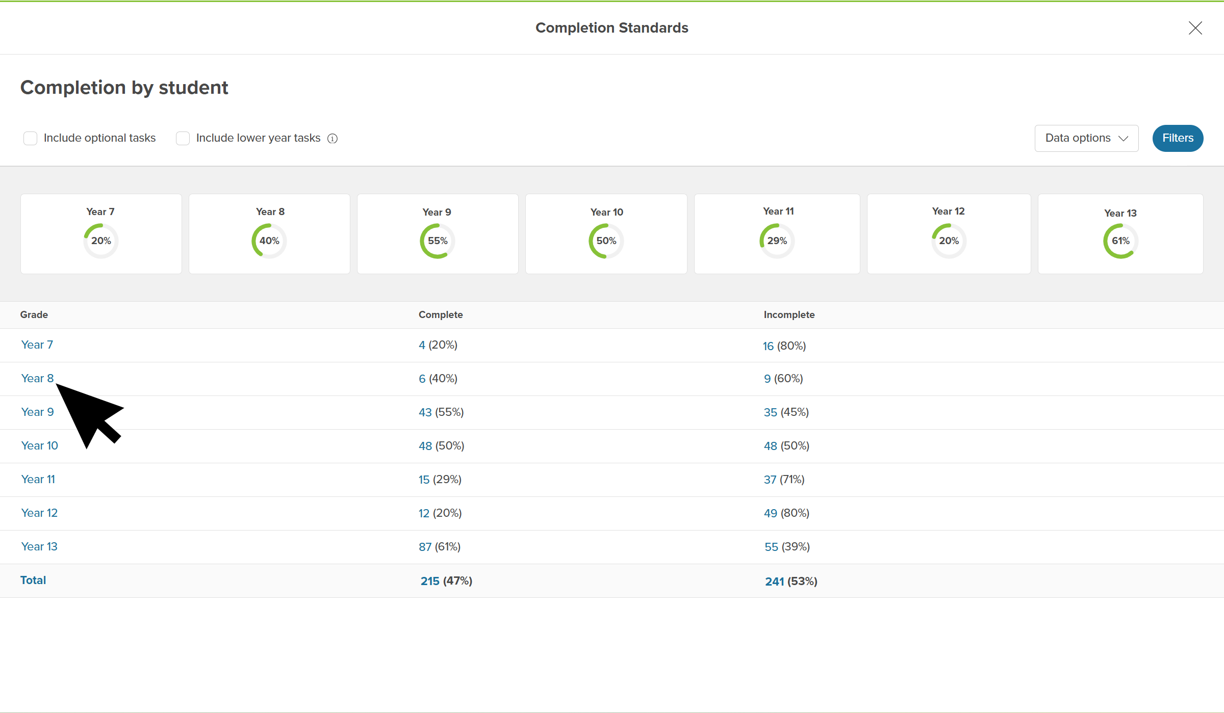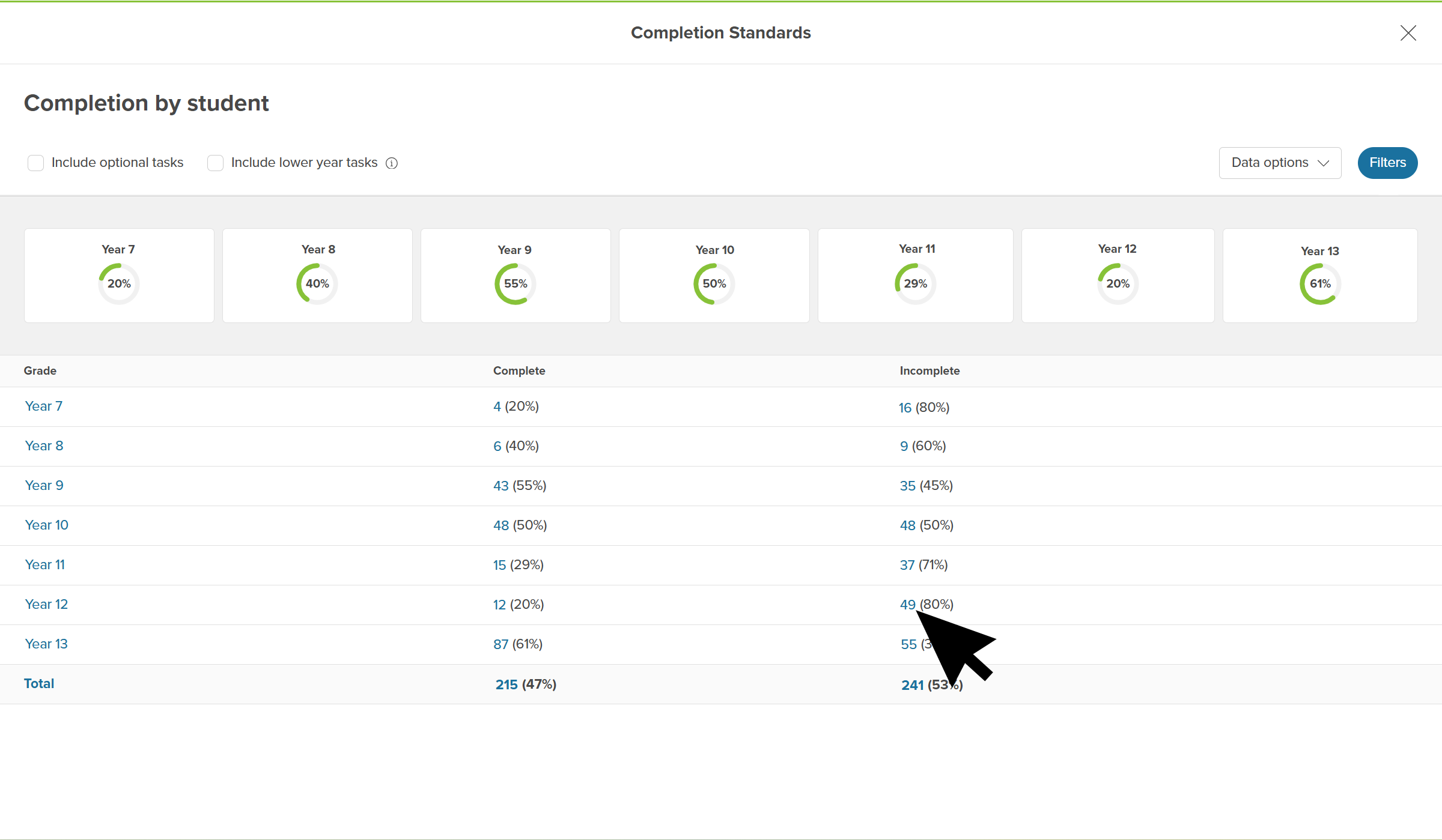• In the Incomplete column, click the number next to the percentage to open the list of students in that year and the tasks they have not completed.