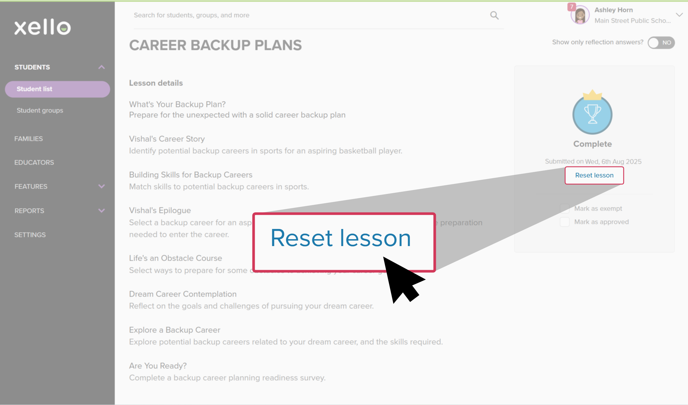 It happens: sometimes a student makes a mistake in an activity or lesson and needs to start over. In Xello, you can reset a lesson and delete all of the student's progress to give the student a fresh start.