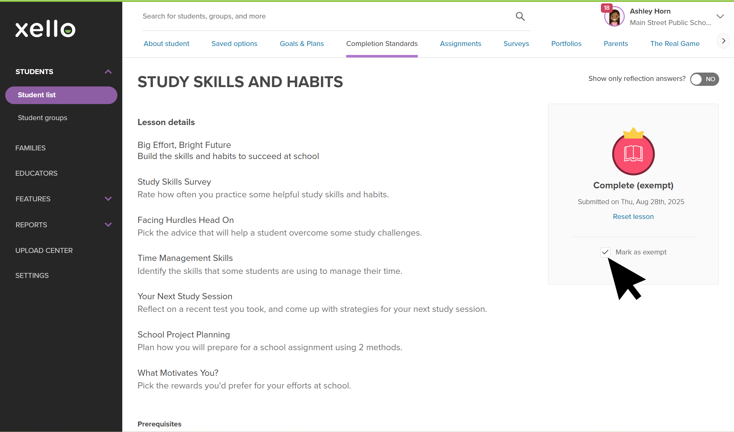A student's profile in Xello on the Completion Standards tab. The Study skills and habits lesson is open. The cursor is highlighting the Mark as exempt box.