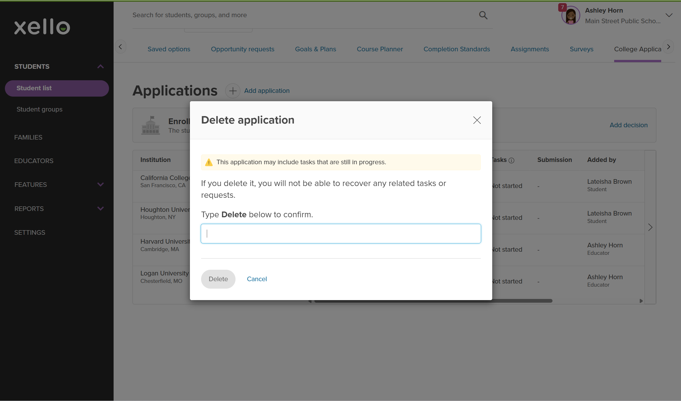 Adding an application is done from the student's profile in Xello. Once you've added the application, you'll be able to view your addition, plus any applications added by other educators or the student.