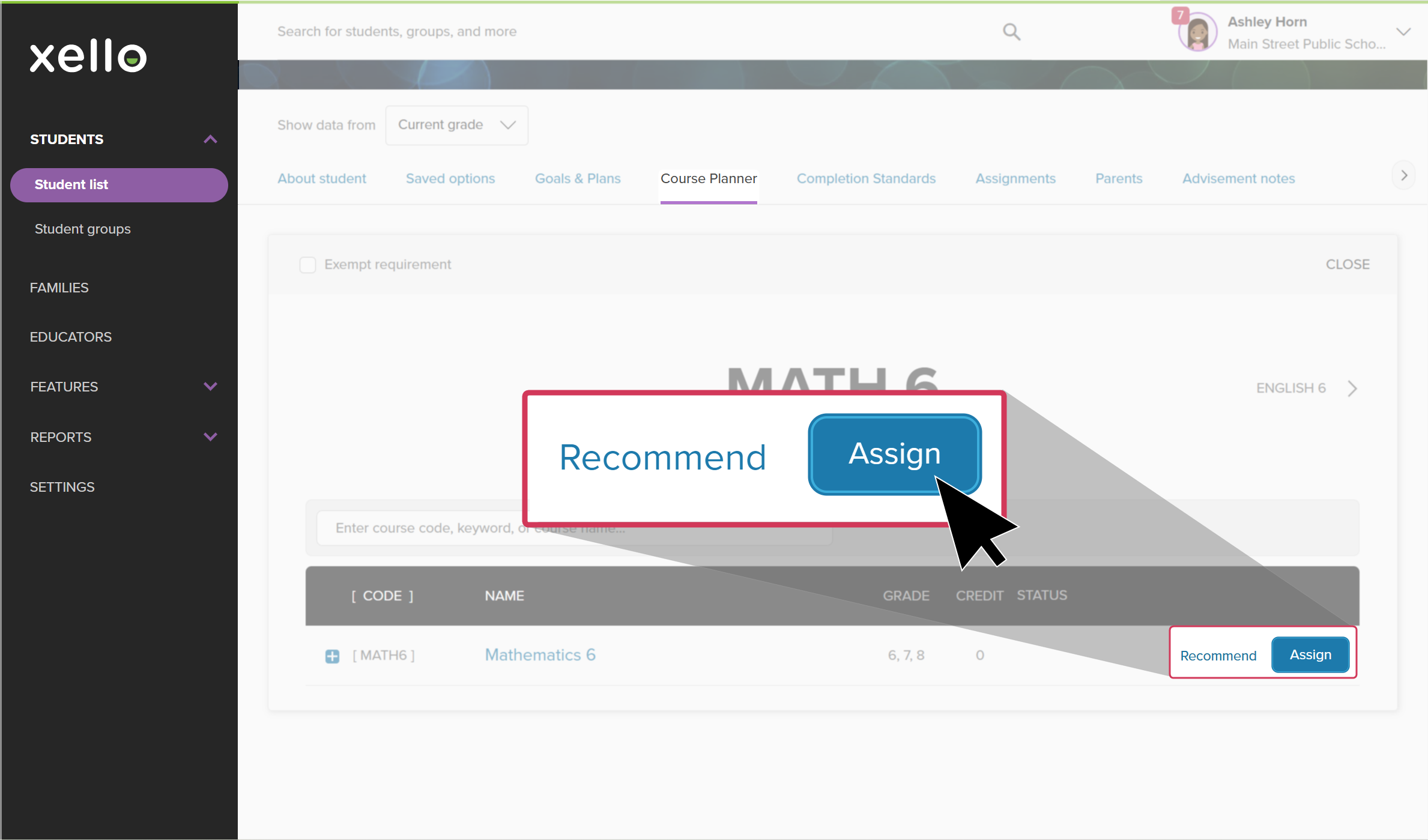 As an educator, you have the ability to view your student’s course plans and assign a course or override one of their course choices, if necessary. You can also recommend a course for them to review.