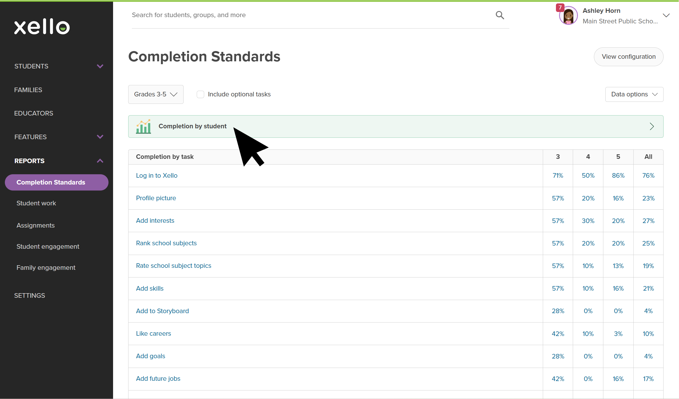 Educator account in Xello. The Completion Standards report page is open. The cursor is clicking the Completion by student banner.