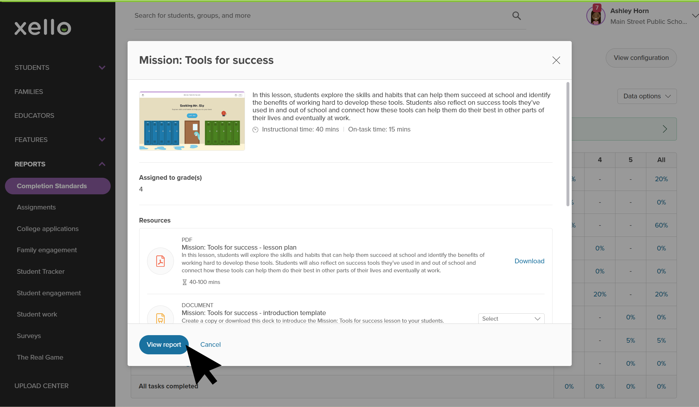 Educator account in Xello. The Mission: Tools for success lesson modal is open. The cursor is clicking View report.