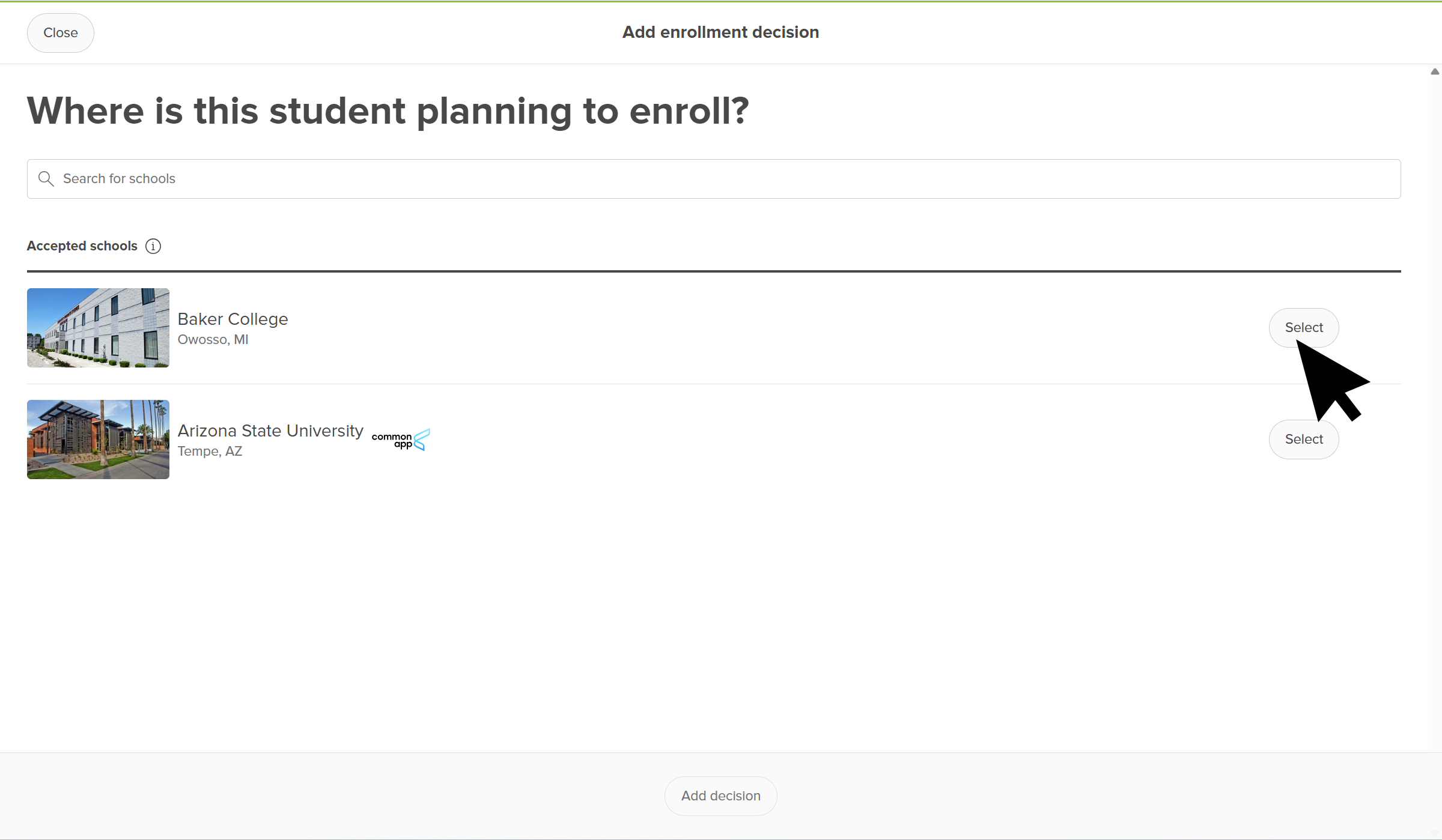 - If the student hasn't recorded their accepted schools, the parent can search for and add them.