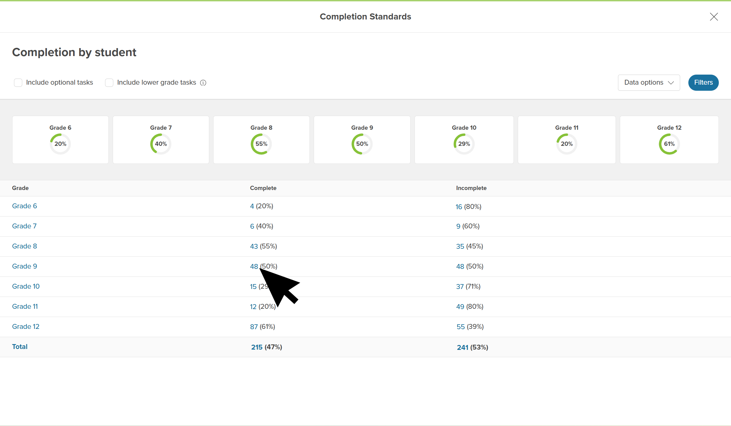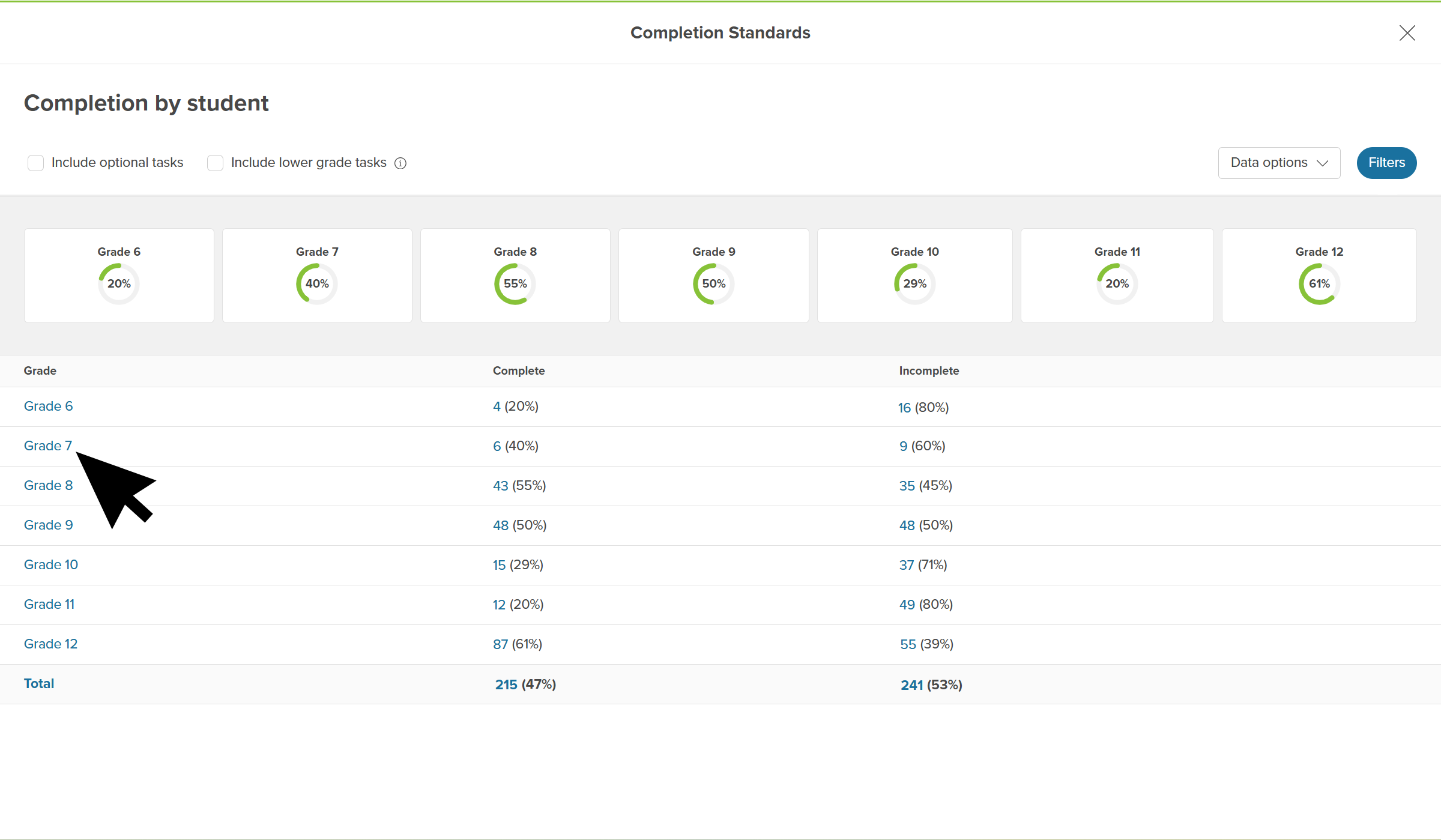 • In the Complete column, click the number next to the percentage to open the list of students in that grade and their completed tasks.
