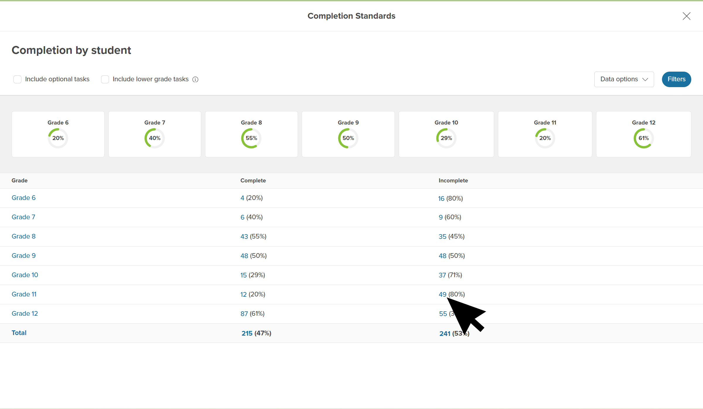 • In the Incomplete column, click the number next to the percentage to open the list of students in that grade and the tasks they have not completed.