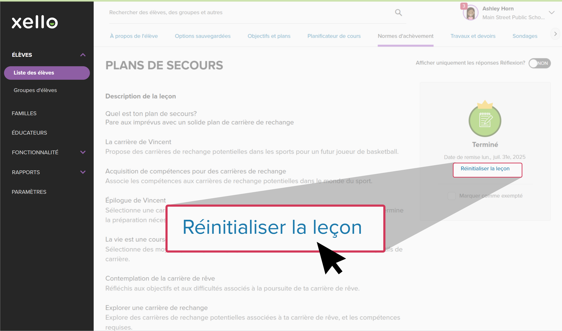 Il arrive parfois qu'un élève doive recommencer une activité ou une leçon après avoir fait une erreur. Dans Xello, vous pouvez réinitialiser une leçon et supprimer tous les progrès de l'élève pour que celui-ci puisse repartir à zéro.