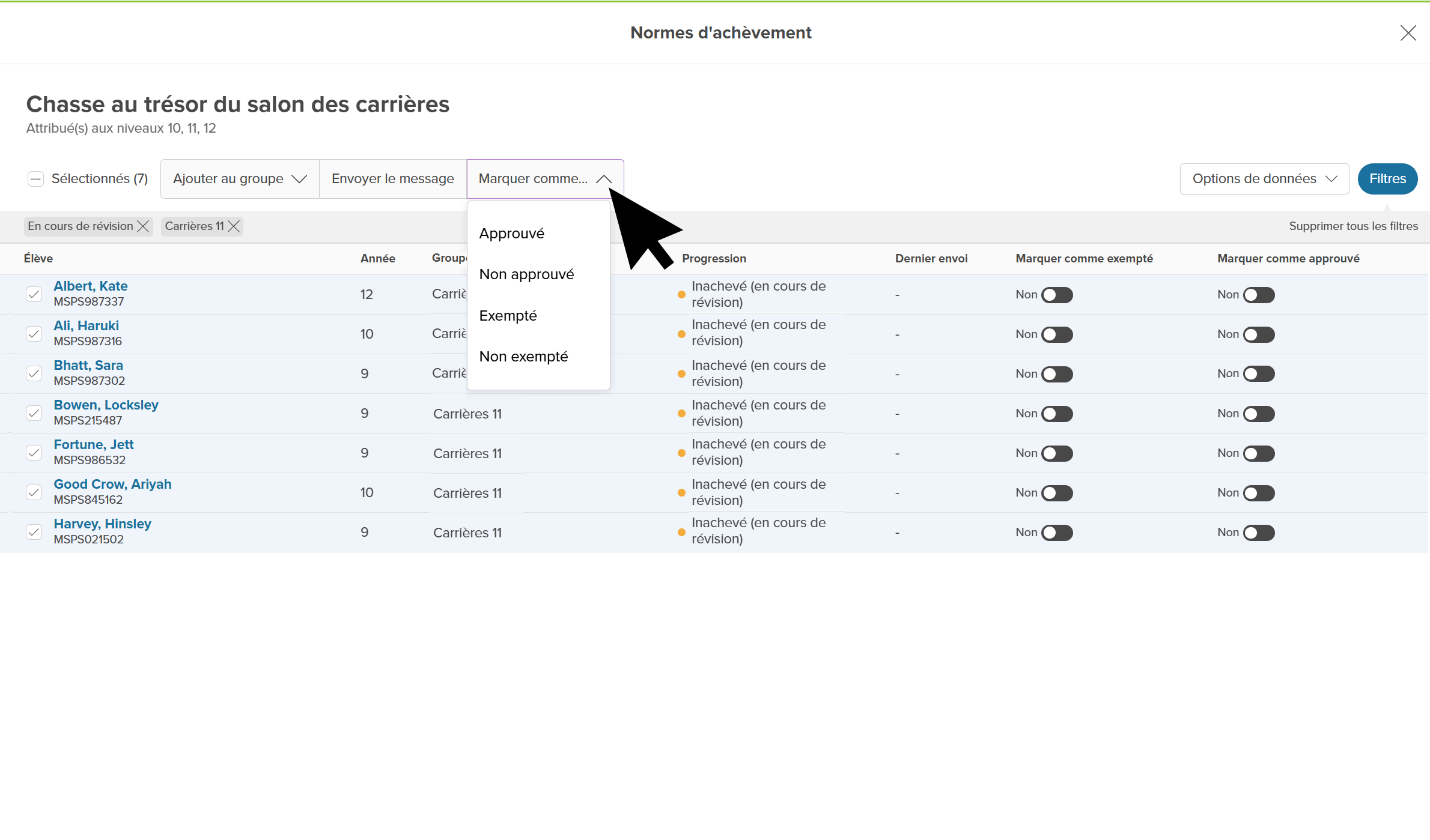 2. À partir de la page du rapport de tâche, dans la ligne de chaque étudiant, activez l’option Marquer comme exempté ou Marquer comme approuvé.