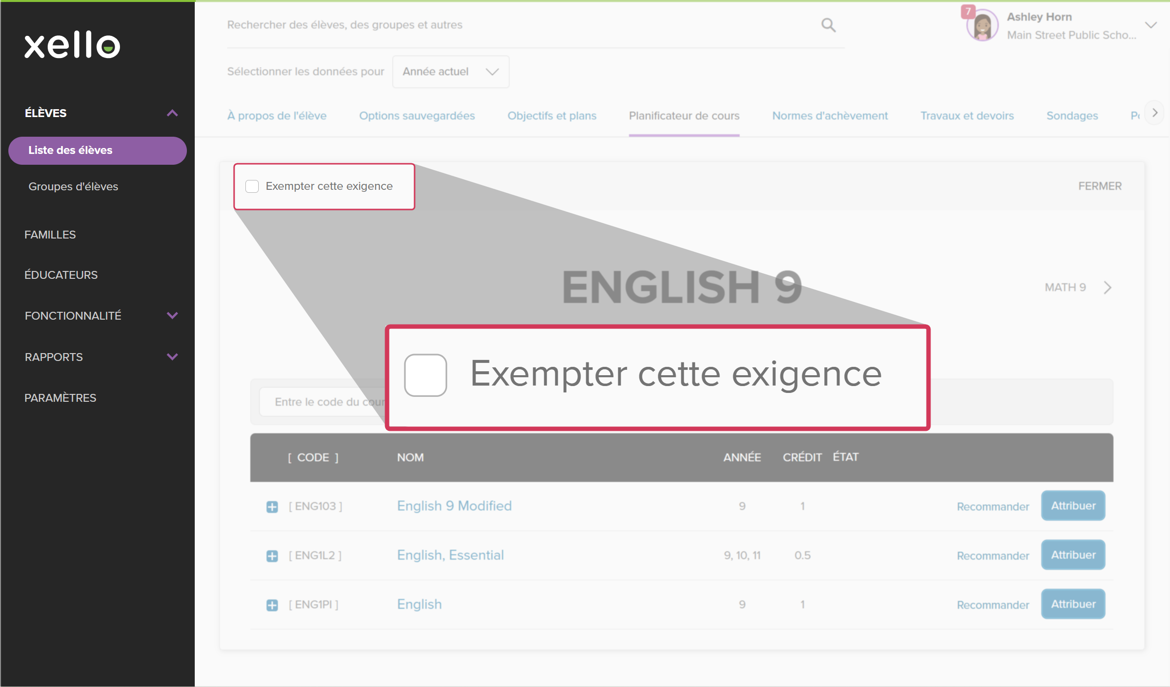 Il arrive parfois qu'un élève ne soit pas soumis à une exigence ou l'ait déjà satisfait, et qu'il faille donc supprimer un cours de son plan de cours. On parle alors d'une exemption dans Xello.